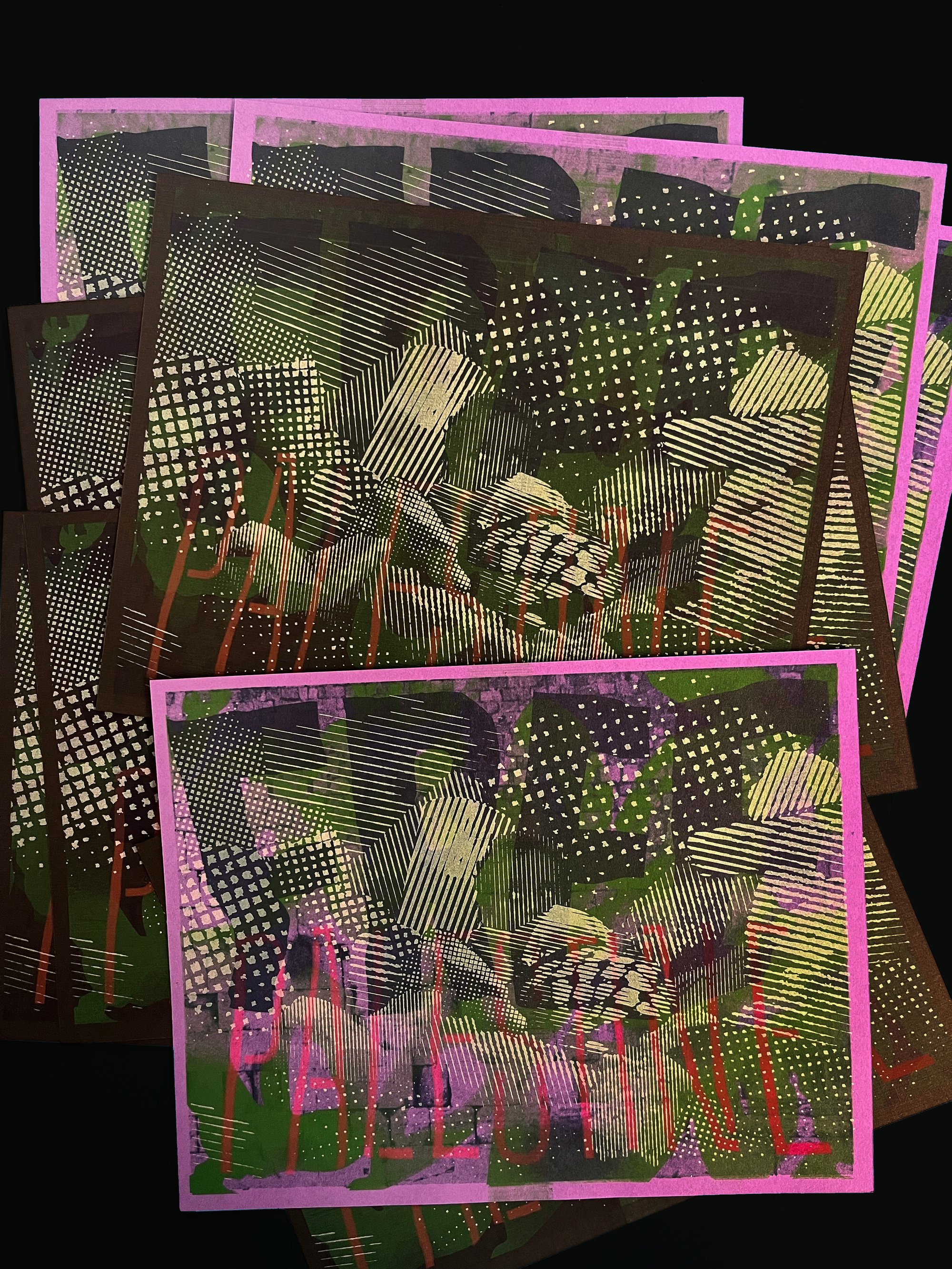 A four-color (eight pass) Risograph print in two different color ways (on black and pinkish purple paper). The image references Munther Isaac's photograph "Christ in the Rubble" from Bethlehem and engages the Palestinian concept of sumud (steadfastness). I will donate half of the proceeds of sales of this print to Watermelon Sisters, a Chicago-based nonprofit providing humanitarian aid to Gaza through art therapy and mental health for women and girls (https://watermelonsisters.org/gallery/). Please specify which color way you would like. And if you are local, we can skip shipping and arrange a physical handoff. The 8x10" print fits nicely in a standard 11x14" frame.